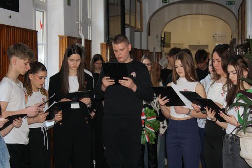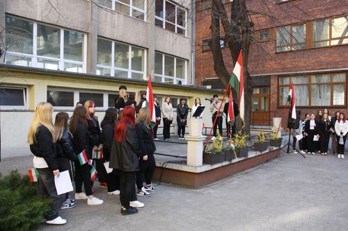 A megemlékezés részeként koszorút helyeztünk el Kossuth Lajos szobránál, majd ünnepi műsorral tisztelegtünk a forradalom és szabadságharc emléke előtt az iskola udvarán.